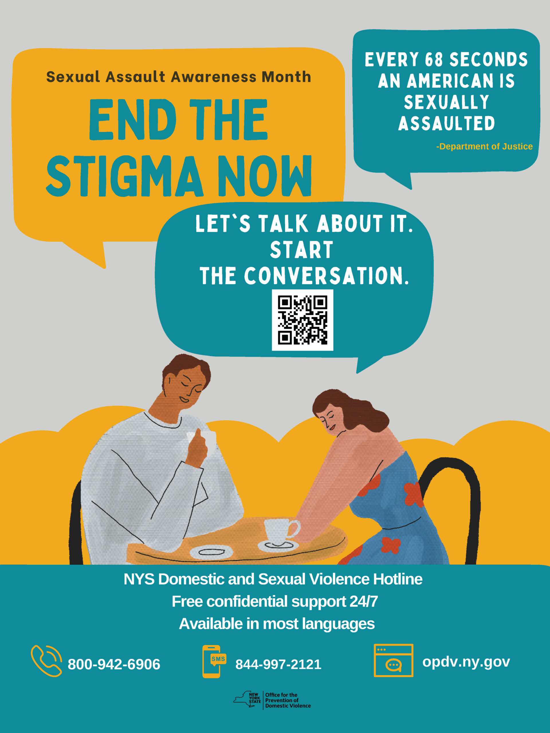 Alternatively, you can reach out to NYS Domestic and Sexual Violence Hotline by calling 800-942-6906, texting 844-997-2121, or chatting at www.opdv.ny.gov. The hotline is free, confidential, and available in most languages 24 hours a day, seven days a week.