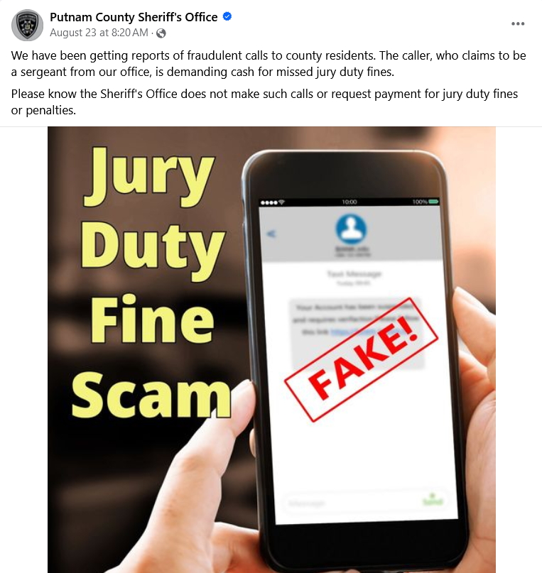 Just recently, it was reported that the Putnam County Sheriff’s Office was used in the scam. Residents reported a person claiming to be a sergeant from the Sheriff’s Office making a request for fines for missing jury service. According to a Facebook post, the Sheriff’s Office noted that the Sheriff’s Office “does not make such calls or request payment for jury duty fines or penalties.” Indeed, the NYS Department of State has issued a warning on its website about the scam.
